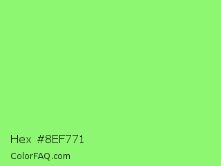 Hex #8ef771 Color is a light green color and the nearest color is Light Green #90ee90. Hex code #8ef771 and RGB value is rgb(142,247,113). In RGB color space, this color is composed of 56% red, 97% green, 44% blue, In CMYK color space, this color is composed of 43% cyan, 0% magenta, 54% yellow , 3% black , In HSL color space, this color has a hue angle of 107° , 89% saturation and 71% lightness.