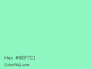 Hex #8ef7c1 Color is a light green color and the nearest color is Teal Deer #99e6b3. Hex code #8ef7c1 and RGB value is rgb(142,247,193). In RGB color space, this color is composed of 56% red, 97% green, 76% blue, In CMYK color space, this color is composed of 43% cyan, 0% magenta, 22% yellow , 3% black , In HSL color space, this color has a hue angle of 149° , 87% saturation and 76% lightness.