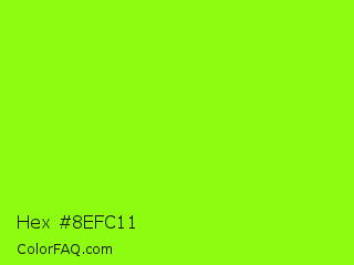 Hex #8efc11 Color is a normal green color and the nearest color is Chartreuse #7fff00. Hex code #8efc11 and RGB value is rgb(142,252,17). In RGB color space, this color is composed of 56% red, 99% green, 7% blue, In CMYK color space, this color is composed of 44% cyan, 0% magenta, 93% yellow , 1% black , In HSL color space, this color has a hue angle of 88° , 98% saturation and 53% lightness.