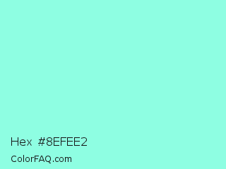 Hex #8efee2 Color is a light cyan color and the nearest color is Aquamarine #7fffd4. Hex code #8efee2 and RGB value is rgb(142,254,226). In RGB color space, this color is composed of 56% red, 100% green, 89% blue, In CMYK color space, this color is composed of 44% cyan, 0% magenta, 11% yellow , 0% black , In HSL color space, this color has a hue angle of 165° , 98% saturation and 78% lightness.