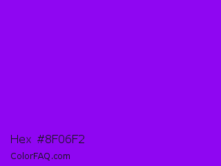 Hex #8f06f2 Color is a normal purple color and the nearest color is Electric Violet #8f00ff. Hex code #8f06f2 and RGB value is rgb(143,6,242). In RGB color space, this color is composed of 56% red, 2% green, 95% blue, In CMYK color space, this color is composed of 41% cyan, 98% magenta, 0% yellow , 5% black , In HSL color space, this color has a hue angle of 275° , 95% saturation and 49% lightness.
