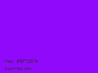 Hex #8f0bfa Color is a normal purple color and the nearest color is Electric Violet #8f00ff. Hex code #8f0bfa and RGB value is rgb(143,11,250). In RGB color space, this color is composed of 56% red, 4% green, 98% blue, In CMYK color space, this color is composed of 43% cyan, 96% magenta, 0% yellow , 2% black , In HSL color space, this color has a hue angle of 273° , 96% saturation and 51% lightness.