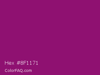 Hex #8f1171 Color is a normal magenta color and the nearest color is Fresh Eggplant #990066. Hex code #8f1171 and RGB value is rgb(143,17,113). In RGB color space, this color is composed of 56% red, 7% green, 44% blue, In CMYK color space, this color is composed of 0% cyan, 88% magenta, 21% yellow , 44% black , In HSL color space, this color has a hue angle of 314° , 79% saturation and 31% lightness.