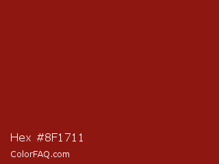 Hex #8f1711 Color is a normal red color and the nearest color is Tamarillo #991613. Hex code #8f1711 and RGB value is rgb(143,23,17). In RGB color space, this color is composed of 56% red, 9% green, 7% blue, In CMYK color space, this color is composed of 0% cyan, 84% magenta, 88% yellow , 44% black , In HSL color space, this color has a hue angle of 3° , 79% saturation and 31% lightness.