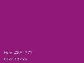 Hex #8f1777 Color is a normal magenta color and the nearest color is Mardi Gras #880085. Hex code #8f1777 and RGB value is rgb(143,23,119). In RGB color space, this color is composed of 56% red, 9% green, 47% blue, In CMYK color space, this color is composed of 0% cyan, 84% magenta, 17% yellow , 44% black , In HSL color space, this color has a hue angle of 312° , 72% saturation and 33% lightness.