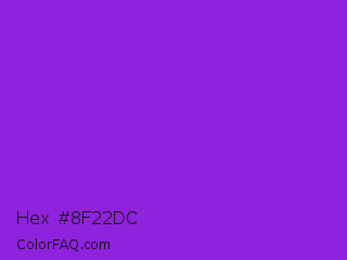 Hex #8f22dc Color is a normal purple color and the nearest color is Blue Violet #8a2be2. Hex code #8f22dc and RGB value is rgb(143,34,220). In RGB color space, this color is composed of 56% red, 13% green, 86% blue, In CMYK color space, this color is composed of 35% cyan, 85% magenta, 0% yellow , 14% black , In HSL color space, this color has a hue angle of 275° , 73% saturation and 50% lightness.