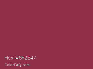 Hex #8f2e47 Color is a normal red color and the nearest color is Solid Pink #893843. Hex code #8f2e47 and RGB value is rgb(143,46,71). In RGB color space, this color is composed of 56% red, 18% green, 28% blue, In CMYK color space, this color is composed of 0% cyan, 68% magenta, 50% yellow , 44% black , In HSL color space, this color has a hue angle of 345° , 51% saturation and 37% lightness.