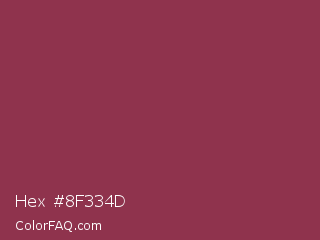 Hex #8f334d Color is a normal rose color and the nearest color is Camelot #893456. Hex code #8f334d and RGB value is rgb(143,51,77). In RGB color space, this color is composed of 56% red, 20% green, 30% blue, In CMYK color space, this color is composed of 0% cyan, 64% magenta, 46% yellow , 44% black , In HSL color space, this color has a hue angle of 343° , 47% saturation and 38% lightness.