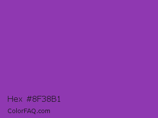 Hex #8f38b1 Color is a normal purple color and the nearest color is Purpureus #9a4eae. Hex code #8f38b1 and RGB value is rgb(143,56,177). In RGB color space, this color is composed of 56% red, 22% green, 69% blue, In CMYK color space, this color is composed of 19% cyan, 68% magenta, 0% yellow , 31% black , In HSL color space, this color has a hue angle of 283° , 52% saturation and 46% lightness.