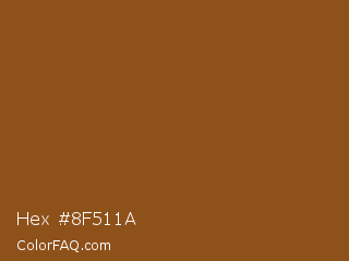 Hex #8f511a Color is a normal orange color and the nearest color is Rope #8e4d1e. Hex code #8f511a and RGB value is rgb(143,81,26). In RGB color space, this color is composed of 56% red, 32% green, 10% blue, In CMYK color space, this color is composed of 0% cyan, 43% magenta, 82% yellow , 44% black , In HSL color space, this color has a hue angle of 28° , 69% saturation and 33% lightness.