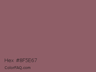 Hex #8f5e67 Color is a normal red color and the nearest color is Mauve Taupe #915f6d. Hex code #8f5e67 and RGB value is rgb(143,94,103). In RGB color space, this color is composed of 56% red, 37% green, 40% blue, In CMYK color space, this color is composed of 0% cyan, 34% magenta, 28% yellow , 44% black , In HSL color space, this color has a hue angle of 349° , 21% saturation and 46% lightness.