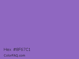 Hex #8f67c1 Color is a normal violet color and the nearest color is Middle Blue Purple #8b72be. Hex code #8f67c1 and RGB value is rgb(143,103,193). In RGB color space, this color is composed of 56% red, 40% green, 76% blue, In CMYK color space, this color is composed of 26% cyan, 47% magenta, 0% yellow , 24% black , In HSL color space, this color has a hue angle of 267° , 42% saturation and 58% lightness.