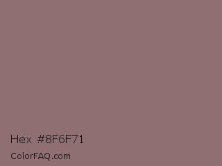 Hex #8f6f71 Color is a normal red color and the nearest color is Opium #8e6f70. Hex code #8f6f71 and RGB value is rgb(143,111,113). In RGB color space, this color is composed of 56% red, 44% green, 44% blue, In CMYK color space, this color is composed of 0% cyan, 22% magenta, 21% yellow , 44% black , In HSL color space, this color has a hue angle of 356° , 13% saturation and 50% lightness.