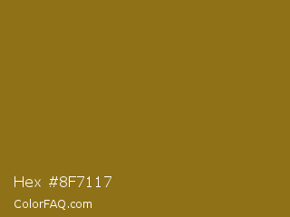 Hex #8f7117 Color is a normal orange color and the nearest color is Sand Dune #967117. Hex code #8f7117 and RGB value is rgb(143,113,23). In RGB color space, this color is composed of 56% red, 44% green, 9% blue, In CMYK color space, this color is composed of 0% cyan, 21% magenta, 84% yellow , 44% black , In HSL color space, this color has a hue angle of 45° , 72% saturation and 33% lightness.