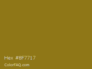 Hex #8f7717 Color is a normal yellow color and the nearest color is Sand Dune #967117. Hex code #8f7717 and RGB value is rgb(143,119,23). In RGB color space, this color is composed of 56% red, 47% green, 9% blue, In CMYK color space, this color is composed of 0% cyan, 17% magenta, 84% yellow , 44% black , In HSL color space, this color has a hue angle of 48° , 72% saturation and 33% lightness.