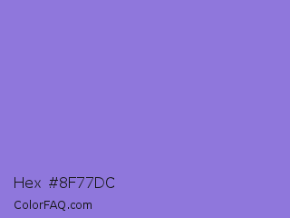 Hex #8f77dc Color is a light indigo color and the nearest color is Medium Purple #9370db. Hex code #8f77dc and RGB value is rgb(143,119,220). In RGB color space, this color is composed of 56% red, 47% green, 86% blue, In CMYK color space, this color is composed of 35% cyan, 46% magenta, 0% yellow , 14% black , In HSL color space, this color has a hue angle of 254° , 59% saturation and 66% lightness.