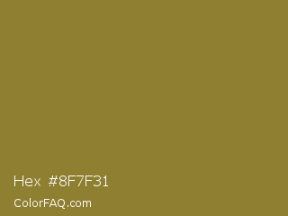 Hex #8f7f31 Color is a normal yellow color and the nearest color is Old Moss Green #867e36. Hex code #8f7f31 and RGB value is rgb(143,127,49). In RGB color space, this color is composed of 56% red, 50% green, 19% blue, In CMYK color space, this color is composed of 0% cyan, 11% magenta, 66% yellow , 44% black , In HSL color space, this color has a hue angle of 50° , 49% saturation and 38% lightness.