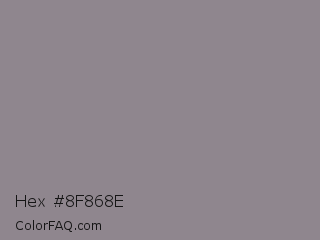 Hex #8f868e Color is a normal magenta color and the nearest color is Venus #928590. Hex code #8f868e and RGB value is rgb(143,134,142). In RGB color space, this color is composed of 56% red, 53% green, 56% blue, In CMYK color space, this color is composed of 0% cyan, 6% magenta, 1% yellow , 44% black , In HSL color space, this color has a hue angle of 307° , 4% saturation and 54% lightness.