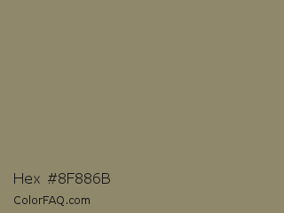 Hex #8f886b Color is a normal yellow color and the nearest color is Olive Haze #8b8470. Hex code #8f886b and RGB value is rgb(143,136,107). In RGB color space, this color is composed of 56% red, 53% green, 42% blue, In CMYK color space, this color is composed of 0% cyan, 5% magenta, 25% yellow , 44% black , In HSL color space, this color has a hue angle of 48° , 14% saturation and 49% lightness.