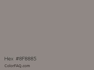 Hex #8f8885 Color is a normal orange color and the nearest color is Taupe Gray #8b8589. Hex code #8f8885 and RGB value is rgb(143,136,133). In RGB color space, this color is composed of 56% red, 53% green, 52% blue, In CMYK color space, this color is composed of 0% cyan, 5% magenta, 7% yellow , 44% black , In HSL color space, this color has a hue angle of 18° , 4% saturation and 54% lightness.