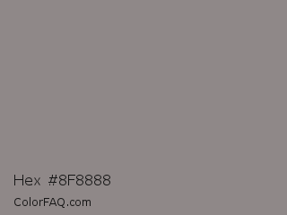 Hex #8f8888 Color is a normal red color and the nearest color is Taupe Gray #8b8589. Hex code #8f8888 and RGB value is rgb(143,136,136). In RGB color space, this color is composed of 56% red, 53% green, 53% blue, In CMYK color space, this color is composed of 0% cyan, 5% magenta, 5% yellow , 44% black , In HSL color space, this color has a hue angle of 0° , 3% saturation and 55% lightness.