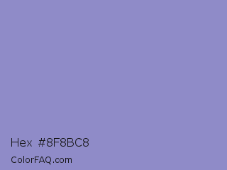 Hex #8f8bc8 Color is a light indigo color and the nearest color is Blue Bell Crayola #9999cc. Hex code #8f8bc8 and RGB value is rgb(143,139,200). In RGB color space, this color is composed of 56% red, 55% green, 78% blue, In CMYK color space, this color is composed of 29% cyan, 31% magenta, 0% yellow , 22% black , In HSL color space, this color has a hue angle of 244° , 36% saturation and 66% lightness.