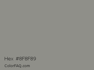 Hex #8f8f89 Color is a normal yellow color and the nearest color is Stack #8a8f8a. Hex code #8f8f89 and RGB value is rgb(143,143,137). In RGB color space, this color is composed of 56% red, 56% green, 54% blue, In CMYK color space, this color is composed of 0% cyan, 0% magenta, 4% yellow , 44% black , In HSL color space, this color has a hue angle of 60° , 3% saturation and 55% lightness.