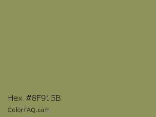 Hex #8f915b Color is a normal yellow color and the nearest color is Moss Green #8a9a5b. Hex code #8f915b and RGB value is rgb(143,145,91). In RGB color space, this color is composed of 56% red, 57% green, 36% blue, In CMYK color space, this color is composed of 1% cyan, 0% magenta, 37% yellow , 43% black , In HSL color space, this color has a hue angle of 62° , 23% saturation and 46% lightness.