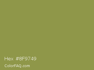 Hex #8f9749 Color is a normal yellow color and the nearest color is Sycamore #908d39. Hex code #8f9749 and RGB value is rgb(143,151,73). In RGB color space, this color is composed of 56% red, 59% green, 29% blue, In CMYK color space, this color is composed of 5% cyan, 0% magenta, 52% yellow , 41% black , In HSL color space, this color has a hue angle of 66° , 35% saturation and 44% lightness.