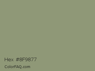 Hex #8f9877 Color is a normal lime color and the nearest color is Artichoke #8f9779. Hex code #8f9877 and RGB value is rgb(143,152,119). In RGB color space, this color is composed of 56% red, 60% green, 47% blue, In CMYK color space, this color is composed of 6% cyan, 0% magenta, 22% yellow , 40% black , In HSL color space, this color has a hue angle of 76° , 14% saturation and 53% lightness.