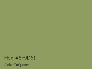 Hex #8f9d61 Color is a normal lime color and the nearest color is Moss Green #8a9a5b. Hex code #8f9d61 and RGB value is rgb(143,157,97). In RGB color space, this color is composed of 56% red, 62% green, 38% blue, In CMYK color space, this color is composed of 9% cyan, 0% magenta, 38% yellow , 38% black , In HSL color space, this color has a hue angle of 74° , 24% saturation and 50% lightness.