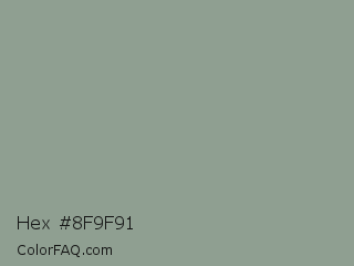 Hex #8f9f91 Color is a normal green color and the nearest color is Mantle #8b9c90. Hex code #8f9f91 and RGB value is rgb(143,159,145). In RGB color space, this color is composed of 56% red, 62% green, 57% blue, In CMYK color space, this color is composed of 10% cyan, 0% magenta, 9% yellow , 38% black , In HSL color space, this color has a hue angle of 128° , 8% saturation and 59% lightness.
