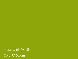 Hex #8fa60b Color is a normal yellow color and the nearest color is Apple Green #8db600. Hex code #8fa60b and RGB value is rgb(143,166,11). In RGB color space, this color is composed of 56% red, 65% green, 4% blue, In CMYK color space, this color is composed of 14% cyan, 0% magenta, 93% yellow , 35% black , In HSL color space, this color has a hue angle of 69° , 88% saturation and 35% lightness.