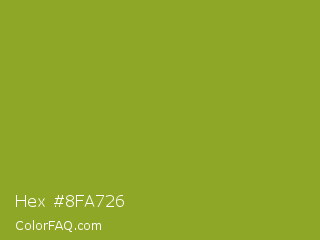 Hex #8fa726 Color is a normal lime color and the nearest color is Citron #9fa91f. Hex code #8fa726 and RGB value is rgb(143,167,38). In RGB color space, this color is composed of 56% red, 65% green, 15% blue, In CMYK color space, this color is composed of 14% cyan, 0% magenta, 77% yellow , 35% black , In HSL color space, this color has a hue angle of 71° , 63% saturation and 40% lightness.