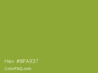 Hex #8fa937 Color is a normal lime color and the nearest color is Sushi #87ab39. Hex code #8fa937 and RGB value is rgb(143,169,55). In RGB color space, this color is composed of 56% red, 66% green, 22% blue, In CMYK color space, this color is composed of 15% cyan, 0% magenta, 67% yellow , 34% black , In HSL color space, this color has a hue angle of 74° , 51% saturation and 44% lightness.