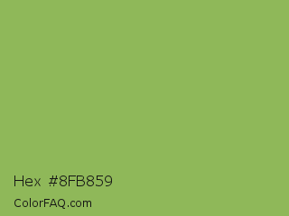 Hex #8fb859 Color is a normal green color and the nearest color is Dollar Bill #85bb65. Hex code #8fb859 and RGB value is rgb(143,184,89). In RGB color space, this color is composed of 56% red, 72% green, 35% blue, In CMYK color space, this color is composed of 22% cyan, 0% magenta, 52% yellow , 28% black , In HSL color space, this color has a hue angle of 86° , 40% saturation and 54% lightness.