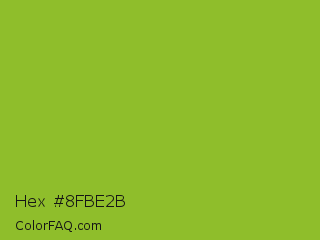 Hex #8fbe2b Color is a normal lime color and the nearest color is Atlantis #97cd2d. Hex code #8fbe2b and RGB value is rgb(143,190,43). In RGB color space, this color is composed of 56% red, 75% green, 17% blue, In CMYK color space, this color is composed of 25% cyan, 0% magenta, 77% yellow , 25% black , In HSL color space, this color has a hue angle of 79° , 63% saturation and 46% lightness.