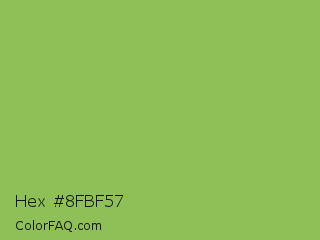 Hex #8fbf57 Color is a normal green color and the nearest color is Dollar Bill #85bb65. Hex code #8fbf57 and RGB value is rgb(143,191,87). In RGB color space, this color is composed of 56% red, 75% green, 34% blue, In CMYK color space, this color is composed of 25% cyan, 0% magenta, 54% yellow , 25% black , In HSL color space, this color has a hue angle of 88° , 45% saturation and 55% lightness.