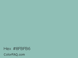 Hex #8fbfb6 Color is a light cyan color and the nearest color is Shadow Green #9ac2b8. Hex code #8fbfb6 and RGB value is rgb(143,191,182). In RGB color space, this color is composed of 56% red, 75% green, 71% blue, In CMYK color space, this color is composed of 25% cyan, 0% magenta, 5% yellow , 25% black , In HSL color space, this color has a hue angle of 169° , 27% saturation and 65% lightness.