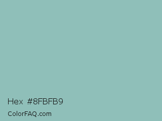 Hex #8fbfb9 Color is a light cyan color and the nearest color is Shadow Green #9ac2b8. Hex code #8fbfb9 and RGB value is rgb(143,191,185). In RGB color space, this color is composed of 56% red, 75% green, 73% blue, In CMYK color space, this color is composed of 25% cyan, 0% magenta, 3% yellow , 25% black , In HSL color space, this color has a hue angle of 173° , 27% saturation and 65% lightness.