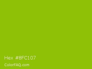 Hex #8fc107 Color is a normal lime color and the nearest color is Apple Green #8db600. Hex code #8fc107 and RGB value is rgb(143,193,7). In RGB color space, this color is composed of 56% red, 76% green, 3% blue, In CMYK color space, this color is composed of 26% cyan, 0% magenta, 96% yellow , 24% black , In HSL color space, this color has a hue angle of 76° , 93% saturation and 39% lightness.