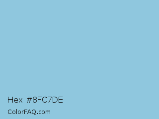 Hex #8fc7de Color is a light blue color and the nearest color is Dark Sky Blue #8cbed6. Hex code #8fc7de and RGB value is rgb(143,199,222). In RGB color space, this color is composed of 56% red, 78% green, 87% blue, In CMYK color space, this color is composed of 36% cyan, 10% magenta, 0% yellow , 13% black , In HSL color space, this color has a hue angle of 197° , 54% saturation and 72% lightness.