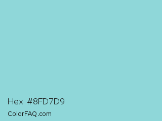 Hex #8fd7d9 Color is a light cyan color and the nearest color is Pale Robin Egg Blue #96ded1. Hex code #8fd7d9 and RGB value is rgb(143,215,217). In RGB color space, this color is composed of 56% red, 84% green, 85% blue, In CMYK color space, this color is composed of 34% cyan, 1% magenta, 0% yellow , 15% black , In HSL color space, this color has a hue angle of 182° , 49% saturation and 71% lightness.
