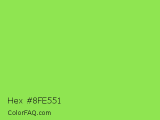 Hex #8fe551 Color is a light green color and the nearest color is Kiwi #8ee53f. Hex code #8fe551 and RGB value is rgb(143,229,81). In RGB color space, this color is composed of 56% red, 90% green, 32% blue, In CMYK color space, this color is composed of 38% cyan, 0% magenta, 65% yellow , 10% black , In HSL color space, this color has a hue angle of 95° , 74% saturation and 61% lightness.