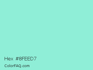 Hex #8feed7 Color is a light cyan color and the nearest color is Riptide #8be6d8. Hex code #8feed7 and RGB value is rgb(143,238,215). In RGB color space, this color is composed of 56% red, 93% green, 84% blue, In CMYK color space, this color is composed of 40% cyan, 0% magenta, 10% yellow , 7% black , In HSL color space, this color has a hue angle of 165° , 74% saturation and 75% lightness.