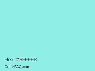 Hex #8feee8 Color is a light cyan color and the nearest color is Riptide #8be6d8. Hex code #8feee8 and RGB value is rgb(143,238,232). In RGB color space, this color is composed of 56% red, 93% green, 91% blue, In CMYK color space, this color is composed of 40% cyan, 0% magenta, 3% yellow , 7% black , In HSL color space, this color has a hue angle of 176° , 74% saturation and 75% lightness.