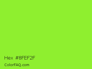 Hex #8fef2f Color is a normal green color and the nearest color is Spring Frost #87ff2a. Hex code #8fef2f and RGB value is rgb(143,239,47). In RGB color space, this color is composed of 56% red, 94% green, 18% blue, In CMYK color space, this color is composed of 40% cyan, 0% magenta, 80% yellow , 6% black , In HSL color space, this color has a hue angle of 90° , 86% saturation and 56% lightness.