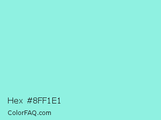 Hex #8ff1e1 Color is a light cyan color and the nearest color is Riptide #8be6d8. Hex code #8ff1e1 and RGB value is rgb(143,241,225). In RGB color space, this color is composed of 56% red, 95% green, 88% blue, In CMYK color space, this color is composed of 41% cyan, 0% magenta, 7% yellow , 5% black , In HSL color space, this color has a hue angle of 170° , 78% saturation and 75% lightness.