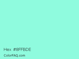 Hex #8ffbde Color is a light cyan color and the nearest color is Aquamarine #7fffd4. Hex code #8ffbde and RGB value is rgb(143,251,222). In RGB color space, this color is composed of 56% red, 98% green, 87% blue, In CMYK color space, this color is composed of 43% cyan, 0% magenta, 12% yellow , 2% black , In HSL color space, this color has a hue angle of 164° , 93% saturation and 77% lightness.
