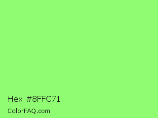 Hex #8ffc71 Color is a light green color and the nearest color is Light Green #90ee90. Hex code #8ffc71 and RGB value is rgb(143,252,113). In RGB color space, this color is composed of 56% red, 99% green, 44% blue, In CMYK color space, this color is composed of 43% cyan, 0% magenta, 55% yellow , 1% black , In HSL color space, this color has a hue angle of 107° , 96% saturation and 72% lightness.